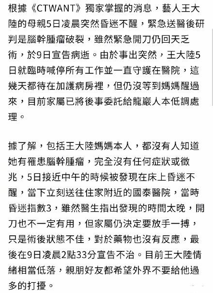 台媒曝王大陆妈妈于8月9日凌晨去世 此时他最需要林允的安慰 娱乐 蛋蛋赞